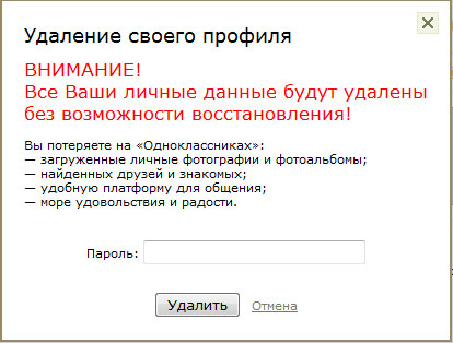 Как известно, прекрасные люди из замечательного сервиса "Жадноклассники" убрали из профиля ссылку "удалить аккаунт". Тем не менее на данный момент удалить себя с этого жлобского сервиса все-таки можно. Это сделать не так уж и сложно. Просто зайдите на свою страницу и в адресной строке в конце допишите строчку &st.layer.cmd=PopLayerDeleteUserProfile. Ну и нажмите ввод, разумеется. Вылезет вот такое окно, где нужно ввести пароль - и все, аккаунт удален.