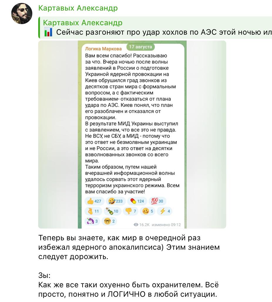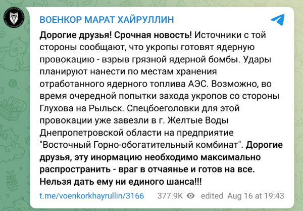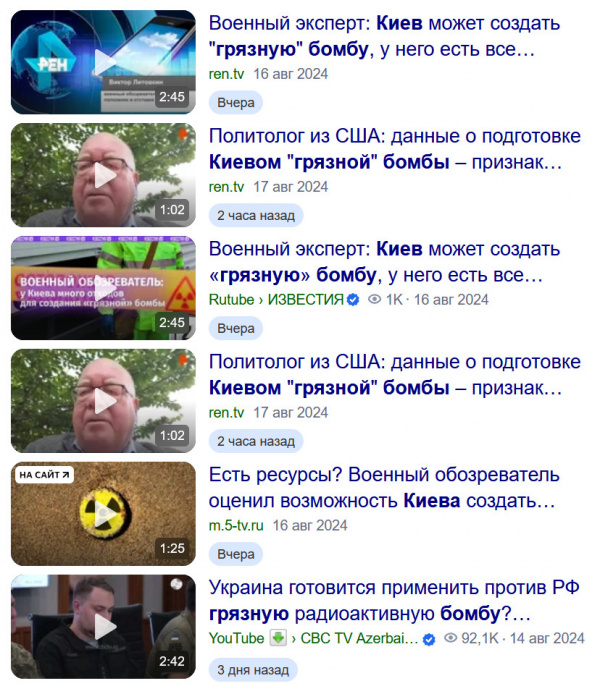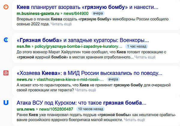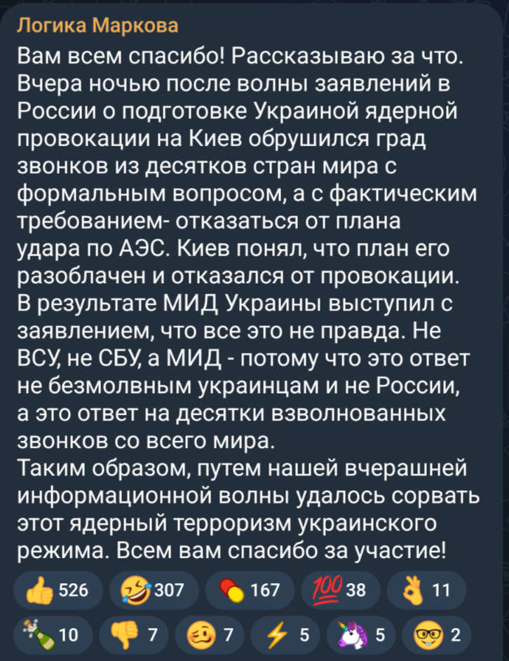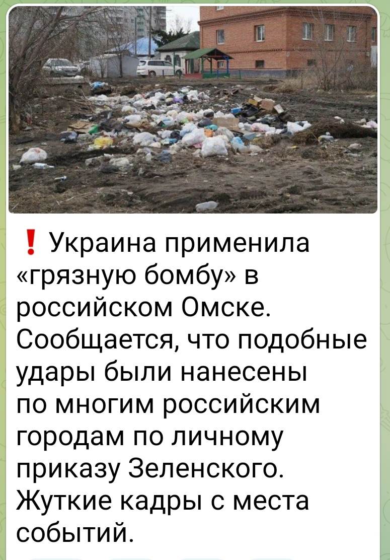 Со вчера в российских средствах массового отупения со страшной силой разносят "новость" о том, что, мол, Киев создал "грязную бомбу" (видимо, вовремя не помыли) и готовится взорвать ее в местах хранения отработанного ядерного топлива АЭС. И в Курской АЭС готовится взорвать, и в Запорожской. И в Фукусимской АЭС тоже взорвет, зуб даём!