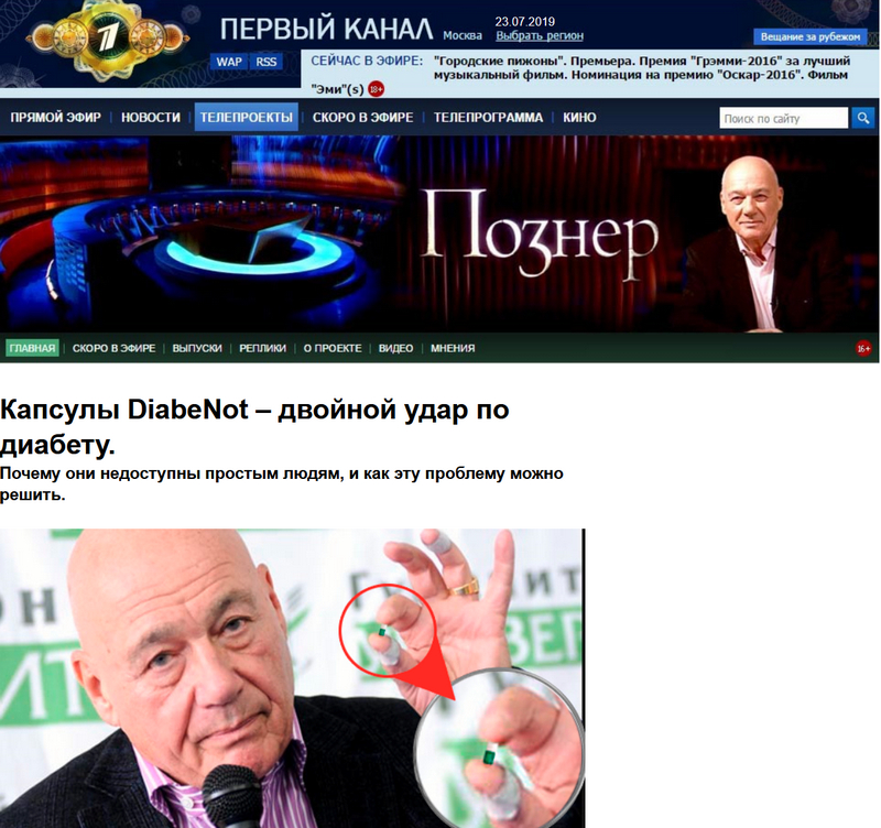 Вот, смотрите, якобы сайт "Первого канала", где Познер рекламирует DiabeNot - мол, он его за границей купил, весь излечился и теперь хочет вылечить всех россиян.