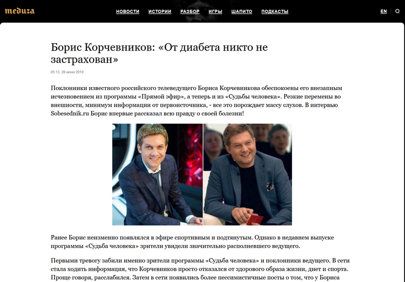 Якобы сайт "Медузы" (все эти поддельные странички располагаются на каких-то мутных западных блогхостингах), где известный телеведущий Борис Корчевников рассказывает, как он вылечился от диабета с помощью очередного фуфлеца под названием SugaNorm.