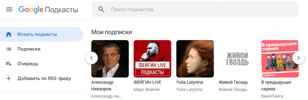 На данный момент у меня такие подписки: Латынина, Невзоров, "Живой гвоздь" (там только какие-то избранные передачи слушаю, вроде Шульман, Белковского и Пархоменко), "Суть событий" Пархоменко, "Что случилось" (Медуза), Фейгин (с основном из-за Арестовича), "В предыдущих сериях", ну и несколько испанских.