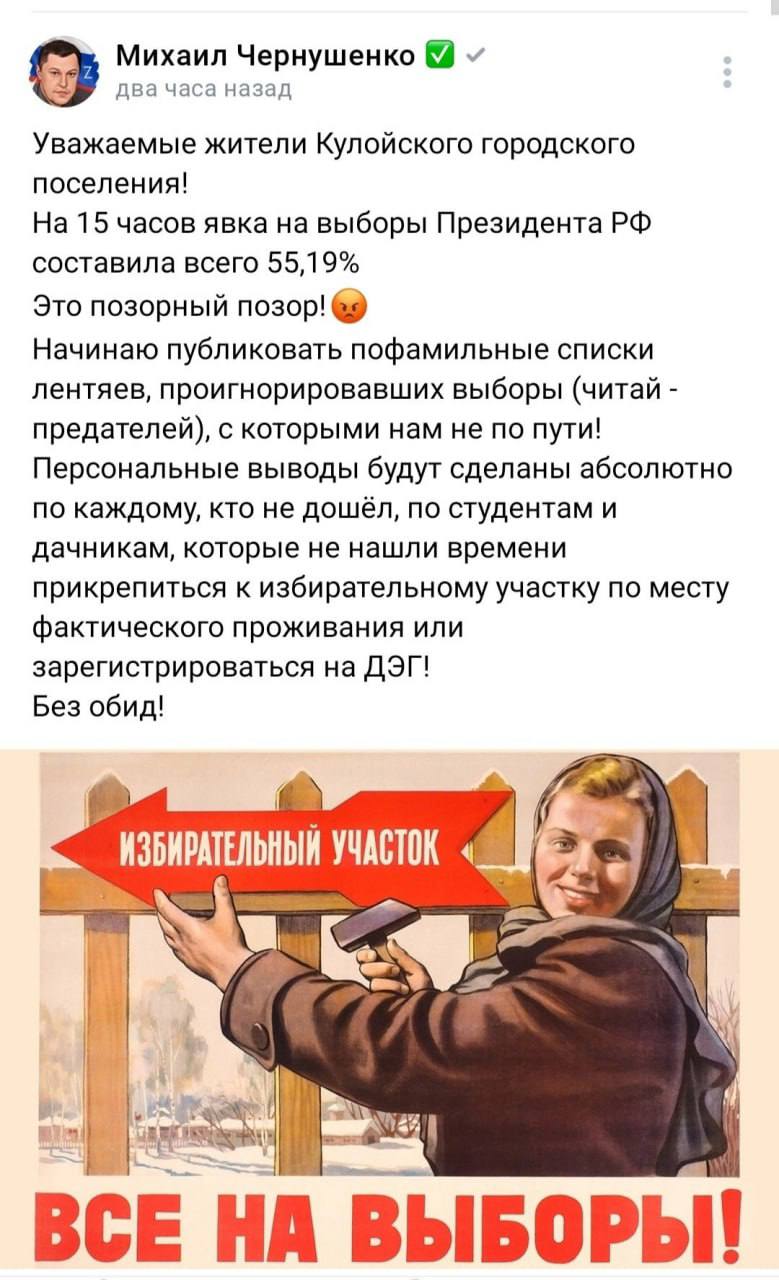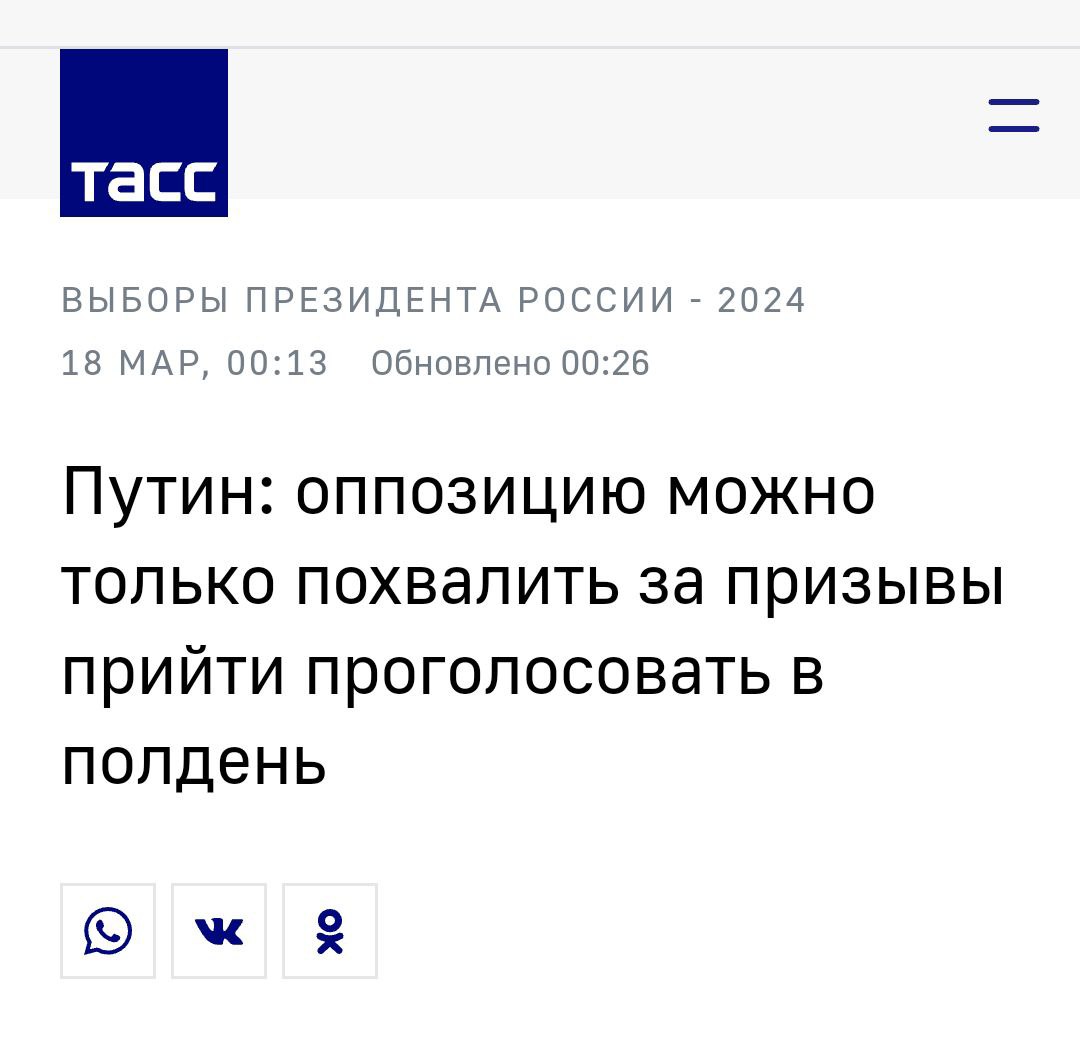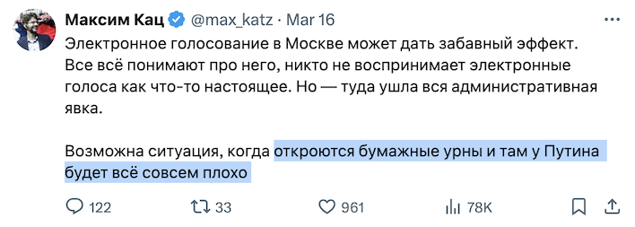 Власти как раз наоборот очень хочется, чтобы завтра никого не было. А то некрасиво как-то будет, нарисуют явку 15 процентов в последний день, при этом в этот день будут очереди, а в остальные нет. И будет как с Надеждиным - у него очереди на сбор подписей и 200к, а у Путина скучающие сборщики и 3.5млна. В итоге даже z-ки смеялись с этого.