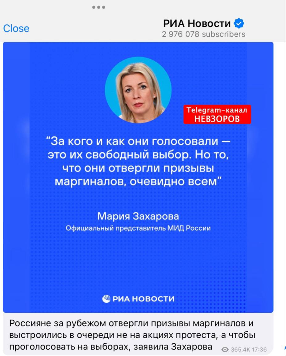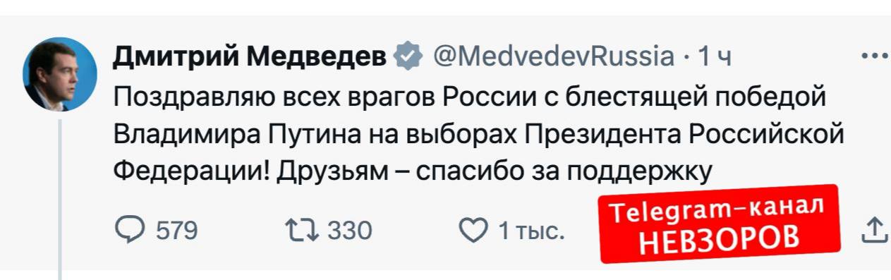 "По моему личному ощущению - ничто так не мотивировало граждан идти на выборы и голосовать за Владимира Владимировича, как личное наблюдение за поведением Запада: наших соседей на территории между Россией и Польшей, наших братушек-болгар, которых мы от турков спасали, наших братьев-чехов, которых мы так любили и ценили, немцев, признательных за спасение от нацизма и сохранения государства, лягушкожующих храбрых французов, истинных джентльменов-британцев и прочих бледных шведов. Простите, проебалтские вымираты упоминать не стану, много чести...