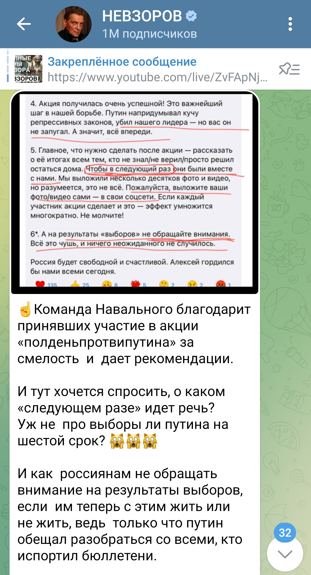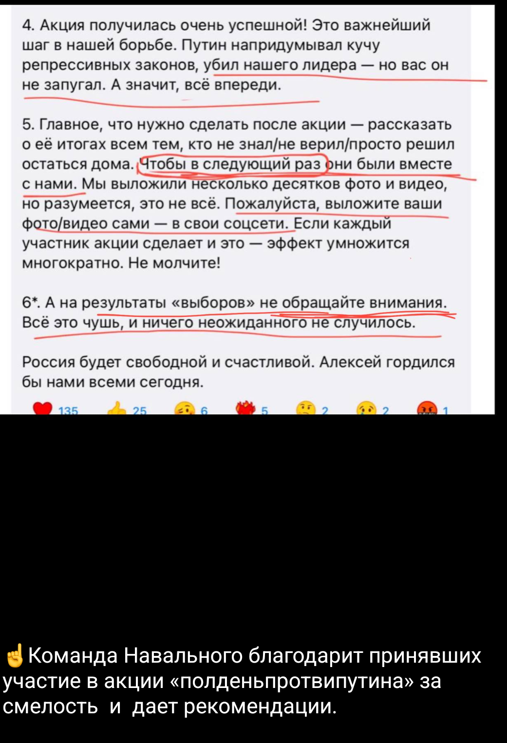 Стоит обратить внимание не на то, что сказано, а на то, что не упомянуто. Нет слова о войне. О борьбе, не сводящейся к болтовне (саботаж, не ходить в армию, не работать на войну и т.д.). Нет упоминания конкурентов из числа оппозиции. Только ежедневно молиться по 15 минут на ФБК.