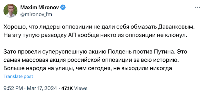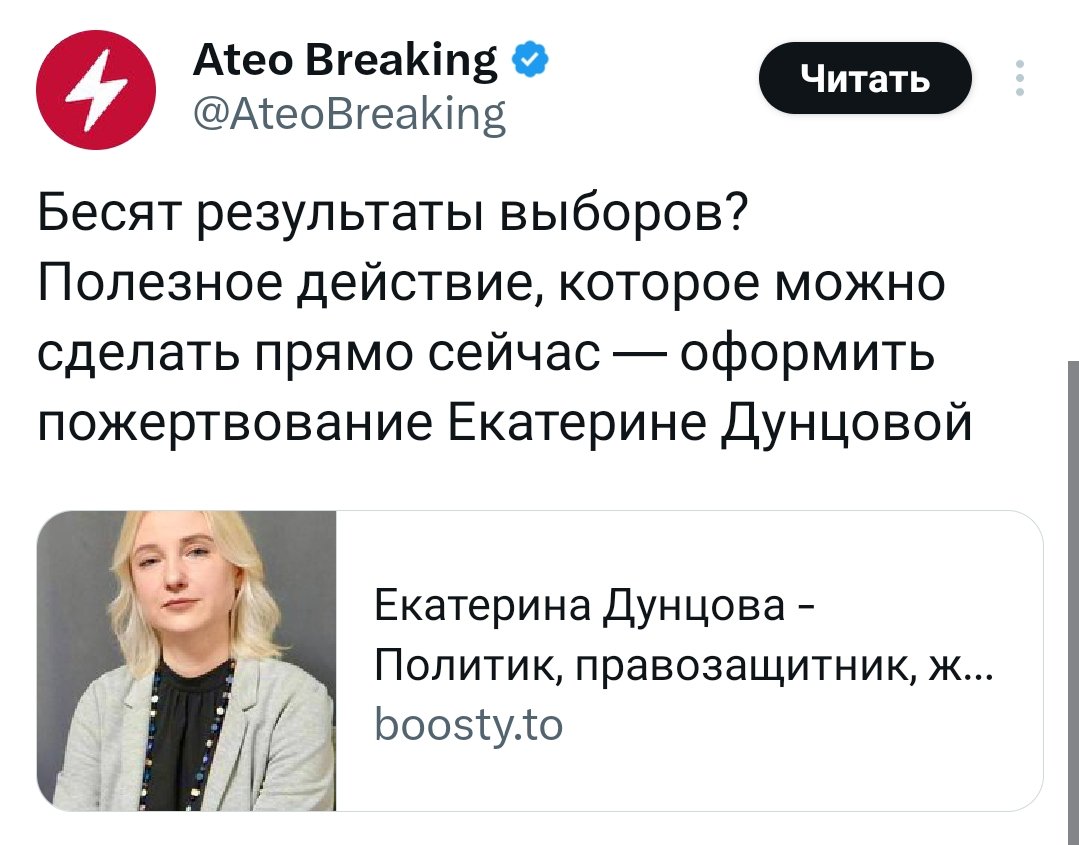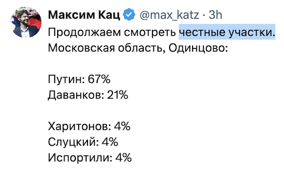 Соболь, Певчих (иноагенты) валят все на Даванкова (читай на Каца, также иноагент). Мол, одно дело голосовать за "любого против", а другое — позиционировать Даванкова как "кандидата за мир".