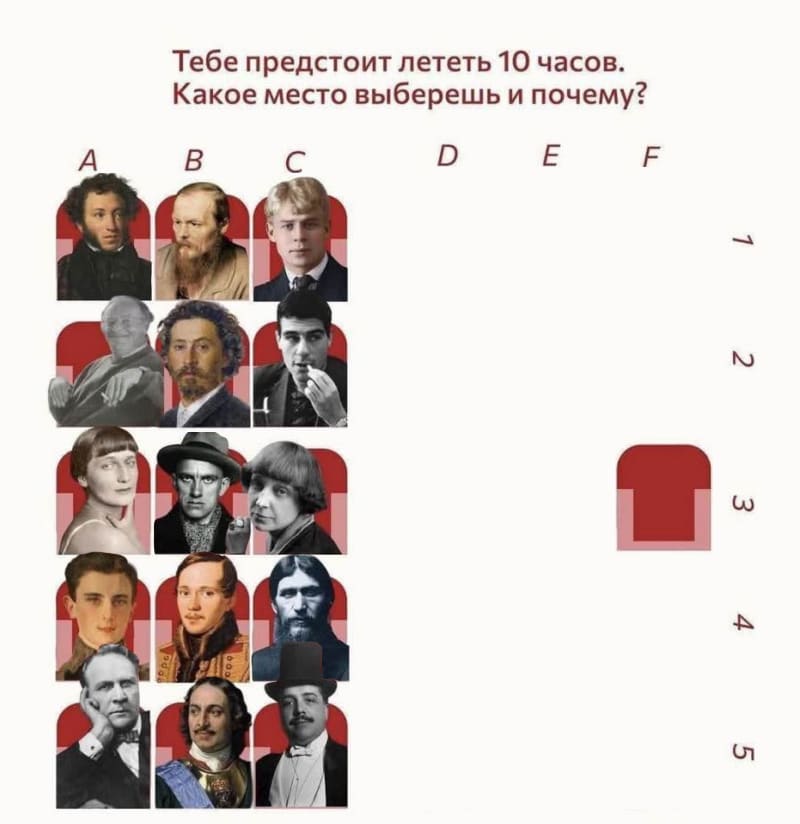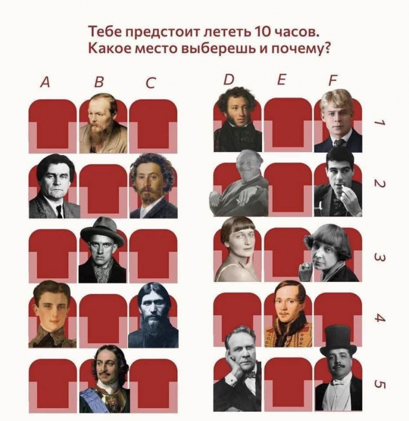 В соцсетях завирусился несколько дурацкий, на мой взгляд, опрос. Но все с увлечением обсуждают, с кем они хотят лететь десять часов - с Достоевским, Маяковским или будучи намертво зажатым между Пушкиным и Есениным.