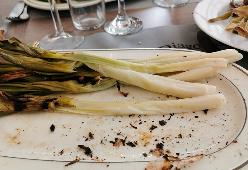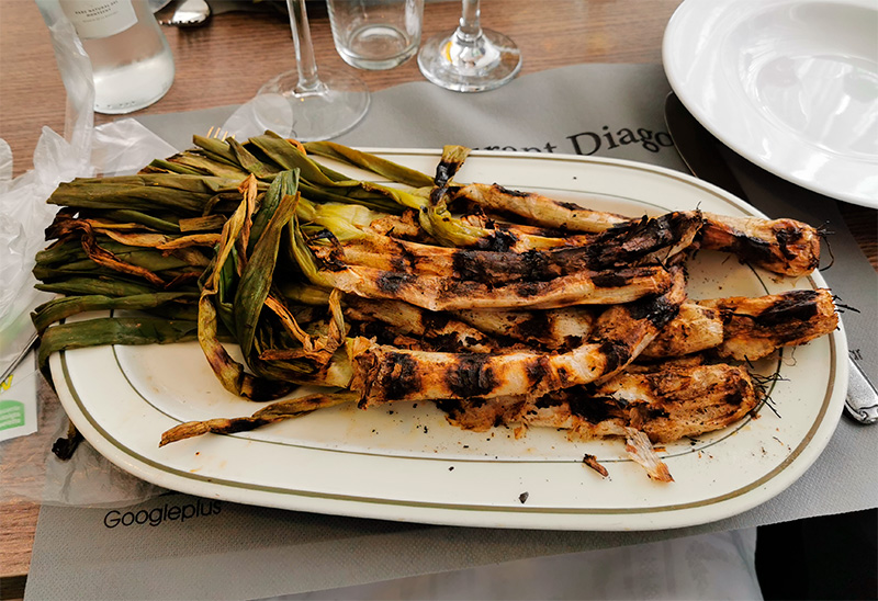 Едят его так: лук берется за зеленый стебель, после чего второй рукой с него снимается обгорелый слой и верхний белый слой лука, который жестковатый и волокнистый. Оставшуюся белую часть лука окунают в соус и едят. Блюдо очень нежное и вкусное, на самом деле. В Каталонии его обычно подают в феврале-марте и начале апреля.