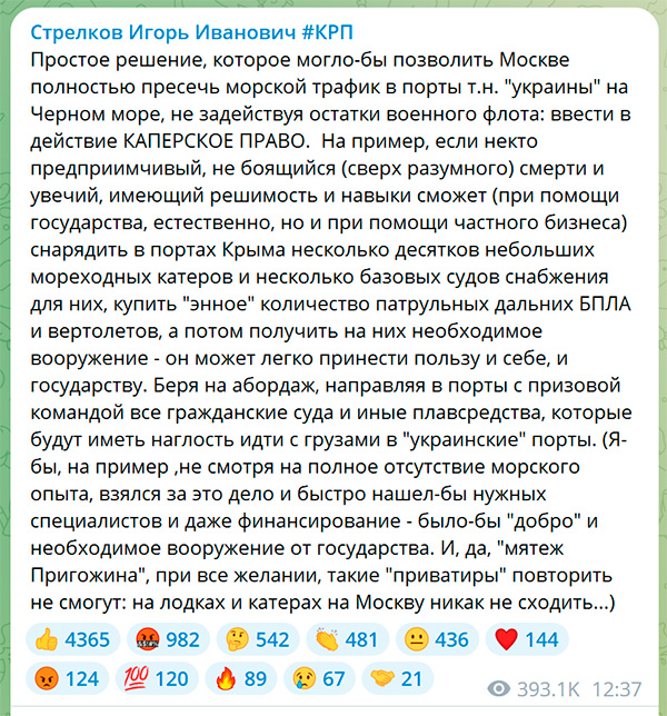 Великий стратег Гиркин предлагает возродить в XXI веке "каперское право". Раньше он казался немного умнее. Как выяснилось, только казался. Такое мог написать только законченный кретин, не умеющий просчитать даже на один шаг вперед.