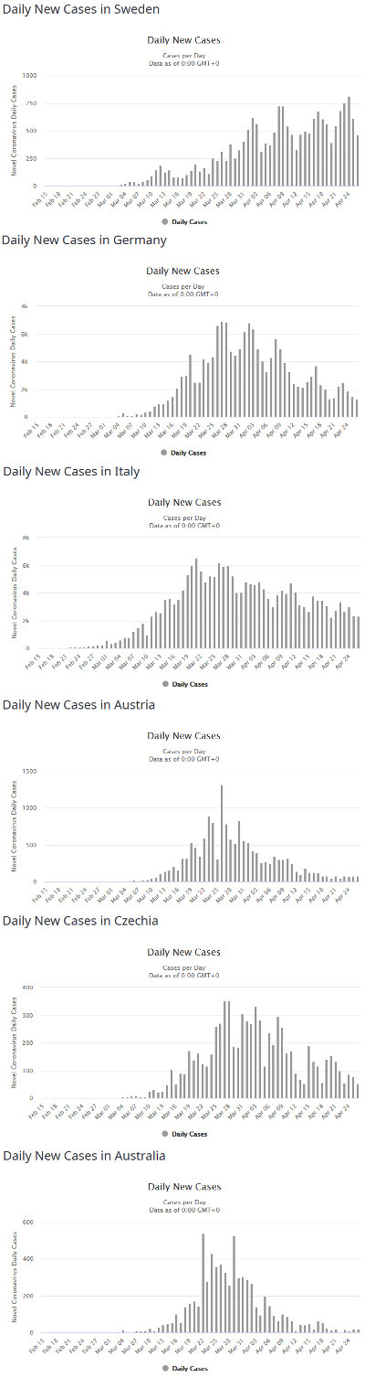 По странам. Италия была на графиках. В Испании количество как новых, так и активных случаев уменьшается, почему и послабления. В США с помощью карантина удалось превратить экспоненциальный рост новых случаев в "плато". В Голландии количество новых случаев медленно идёт на спад, как и в Бельгии.