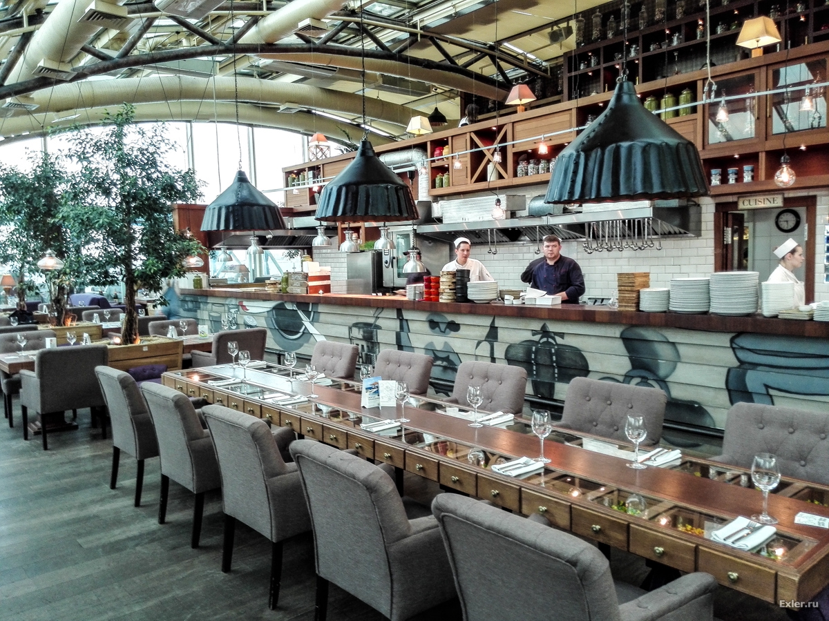 Внутреннее помещение с открытой кухней - можно наблюдать за процессом приготовления еды.