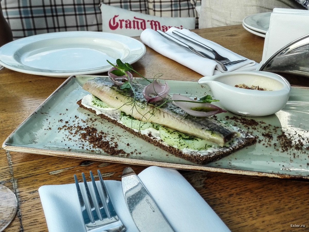 Ну, вроде все посмотрели - пошли пробовать кухню. Первой шла брускетта а-ля Рюсс: бородинский хлеб, картошечка, селедочка. Я-то всегда считал, что это бутерброд охотника и рыболова. Но пусть будет брускетта.
