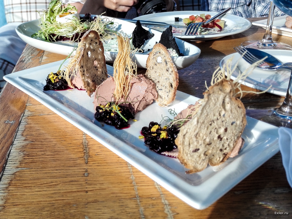 Вот это блюдо мне очень понравилось: мусс из телячьей печени с черничным вареньем. Я вообще всякие фуагры как-то не особо жалую, но этот мусс был нежнейший и очень вкусный.