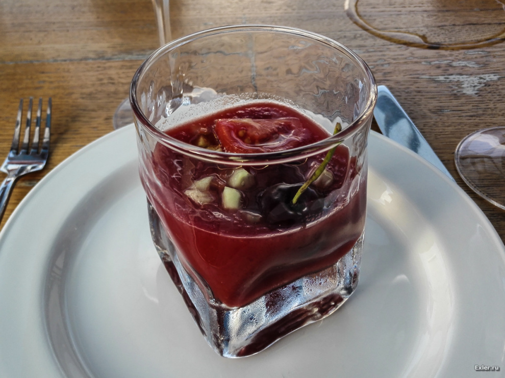 Вишнево-томатное гаспаччо с овощами. Тоже очень прикольно.
