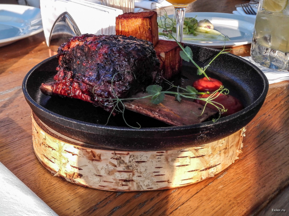 А вот это мне больше всего понравилось - говяжьи ребра. Нежнейшее мясо. Я спросил Карло, как он обходится без всякой европейской и прочей говядины, он ответил, что использует российское мясо и для гарантии качества готовит его по технологии су-вид - в вакуумной упаковке много часов на низкой темпратуре.