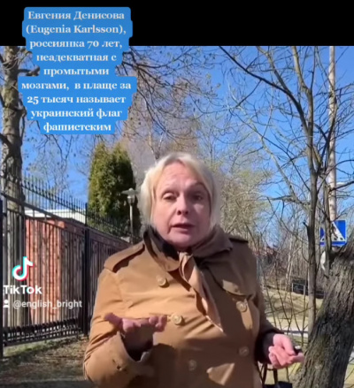Вчера по Сети распространялся ролик с некоей Евгенией Денисовой Карлсон, живущей в Швеции, которая разбрасывала по земле украинскую символику, оскорбляла активистку и угрожала ей физической расправой. Ссылку на этот ролик я давать принципиально не хочу, кому сильно надо - нагуглите.