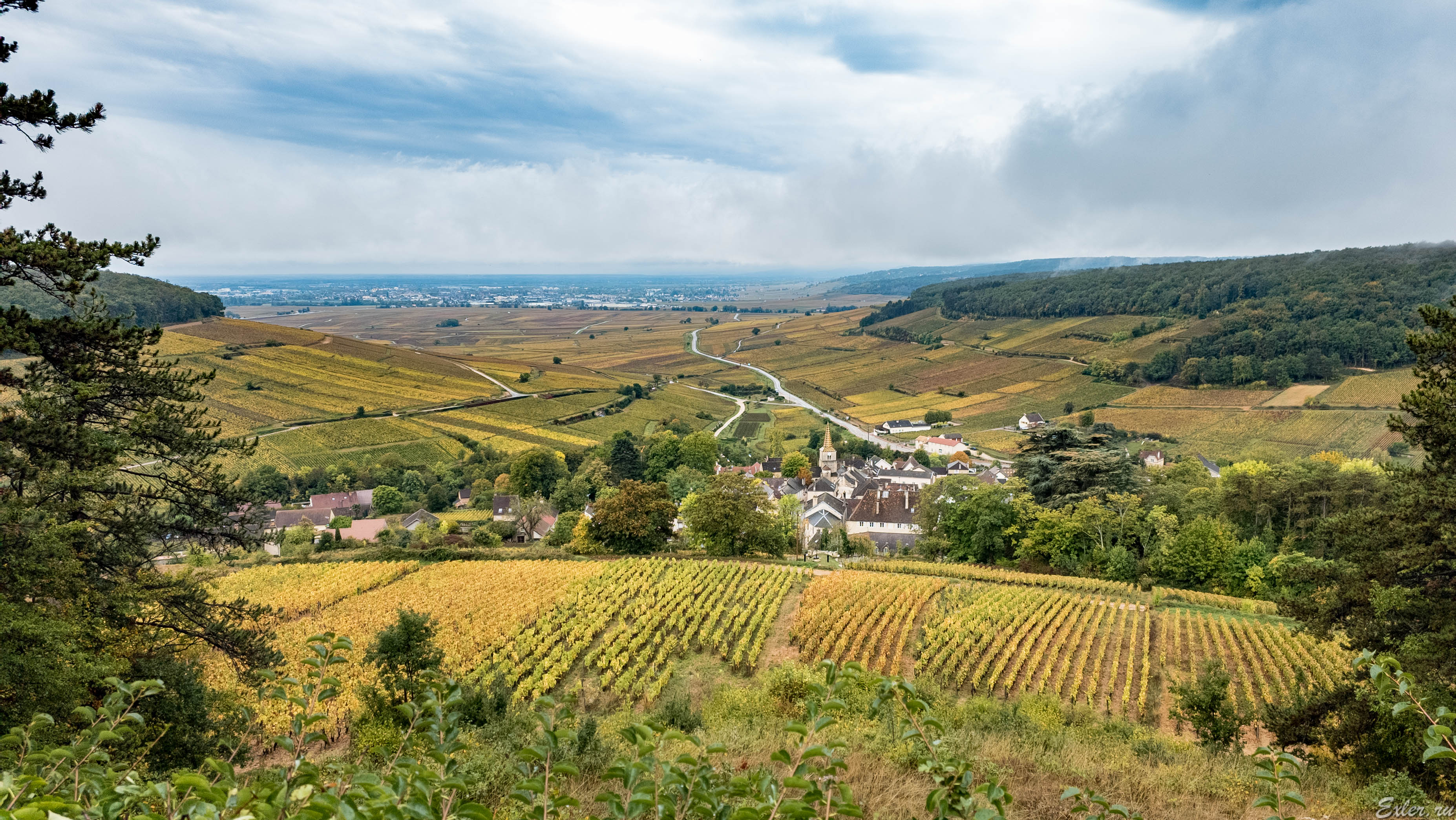Вчера ездили в Бон (Beaune) - столицу Бургундии. И там поднялись на вершину холма Кортон, который находится посреди группы знаменитых винодельческих деревень - Падуа-Серриньи, Алоксе-Кортон, Пернан-Вержелес и Савиньи-ле-Бон. Смотрите, какой оттуда вид открывается. (Погода была ненастная и дождливая, но оно того все равно стоило.)