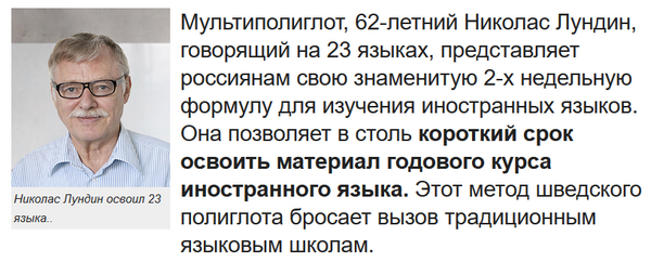 Где уже от какого-нибудь русского имени представляете метод Лендина, рассказываете, что уже двадцать лет руководите лингвистической школой в Москве, которая неоднократно становилась призером главной премии фестиваля в Мончегорске, брякните что-нибудь по поводу "активаторов центров памяти" и "рецепторного запоминания нижневенных хромосом", и не забудьте привести мнение какого-нибудь безусловного авторитета, например (реальная цитата): "Кроме того, что он был исследован командой нейролингвистов, он также был протестирован мною и многими другими людьми, например, Дианой из Нижнего Новгорода".