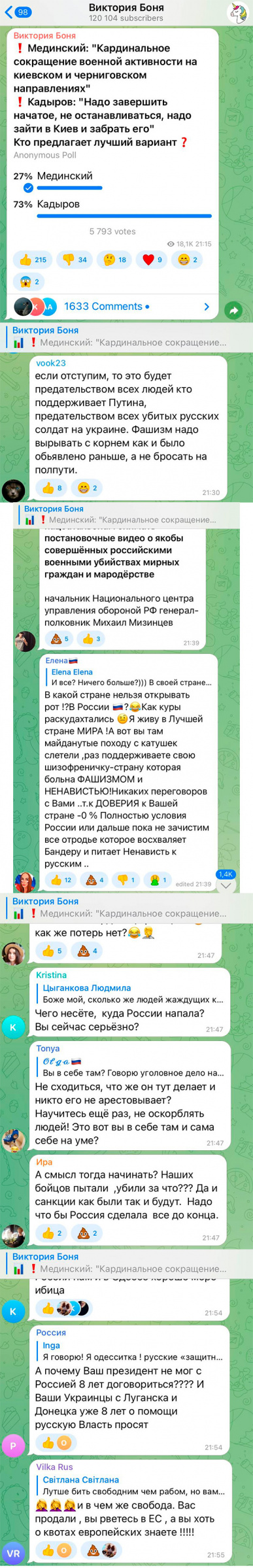А что на самом деле хотят недорогие россияне - хорошо видно в комментах у главного военного эксперта Виктории Бони, которая на время переключилась от чипизации и шапочек из фольги к вопросам гуманитарной миротворческой миссии по демистификации Украины.