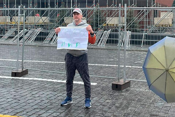 Москвич Андрей Крюков вышел на Красную площадь в Москве с плакатом "Христос за мир". Его задержали. Одиночных пикетчиков задерживают сегодня в разных российских городах.