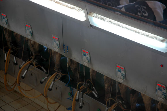 Но самое любопытное - это дойка. Она производится три раза в день. Коров загоняют в доильный зал, там они самостоятельно заходят в специальные загончики, после чего начинается машинная дойка.