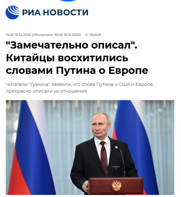 В РИА "Новости" всегда так трогательно видеть заметки из серии "китайцы восхитились", "болгары пришли в восторг", "поляки одобрили выступление президента Путина", "вьетнамцы описались от счастья, когда Песков сказал", "в Северной Корее высоко оценили танец Марии Захаровой" и прочие.