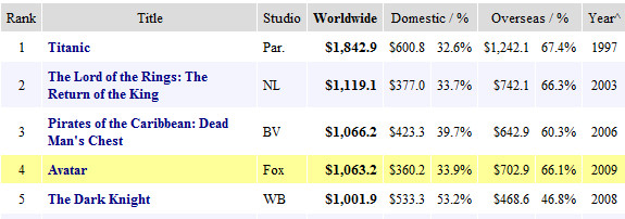 Пять фильмов, заработавших более миллиарда во всемирном прокате. У "Аватара" при этом, конечно, еще не вечер. Я уверен, что с продажами DVD и BR будет за два.