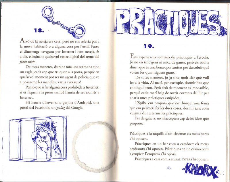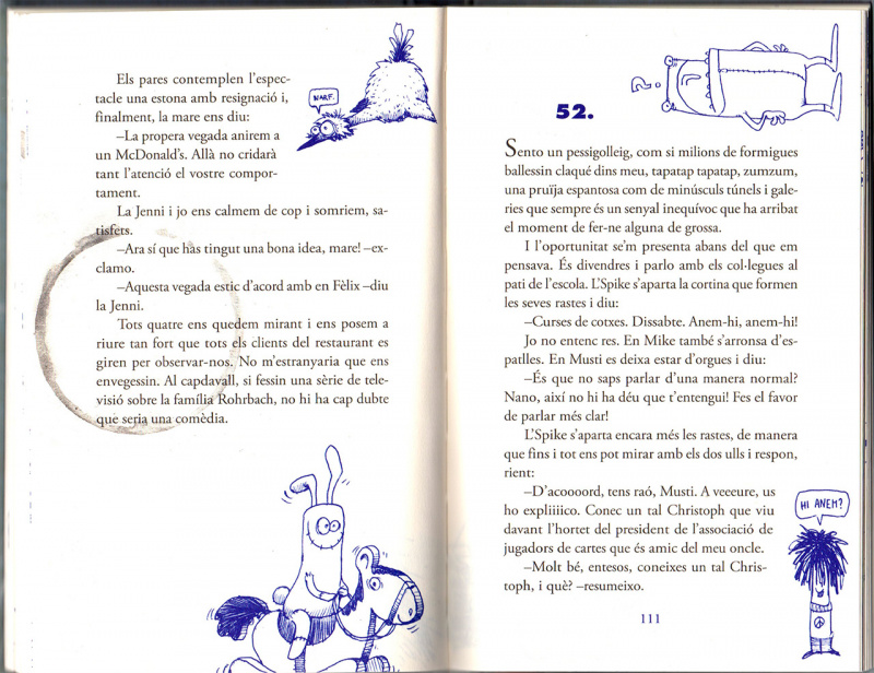 Жена взяла в библиотеке для младшего Экслера книжку на каталанском. Я взял ее полистать и прям засмотрелся: шикарные иллюстрации шариковой ручкой, следы от чашек (еще и на сгибе умудрились поставить) - просто класс! Да, это все типографское, разумеется, так издано.