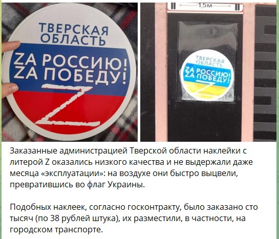 Заказанные администрацией Тверской области наклейки с литерой Z оказались низкого качества и не выдержали даже месяца «эксплуатации»: на воздухе они быстро выцвели, превратившись во флаг Украины.