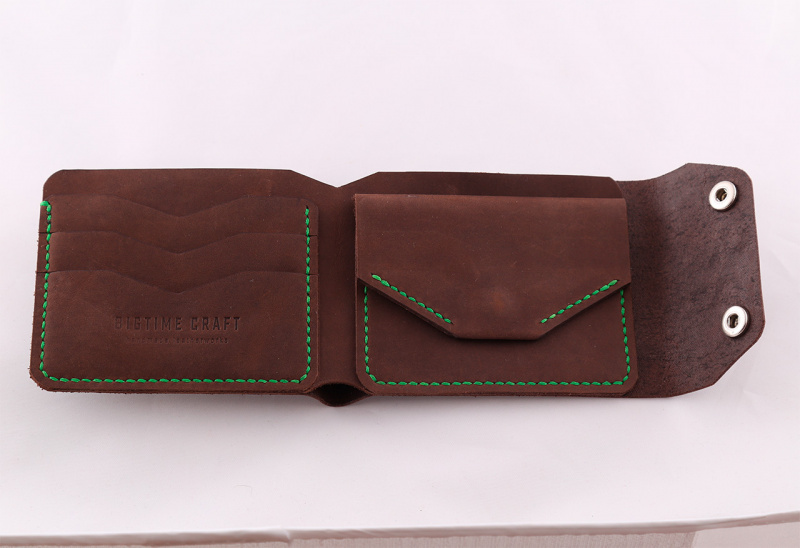 Посмотрел у него раздел кошельков, порылся - и нашел модельку как раз под себя: маленький кошелек (мне это важно, ненавижу распухшие бумажники), но с карманом для монет на кнопках, с отделениями для купюр и тремя карманами для карт. Надпись на кошельке можно заказать под себя, цвет прострочки можно выбрать под свои предпочтения.