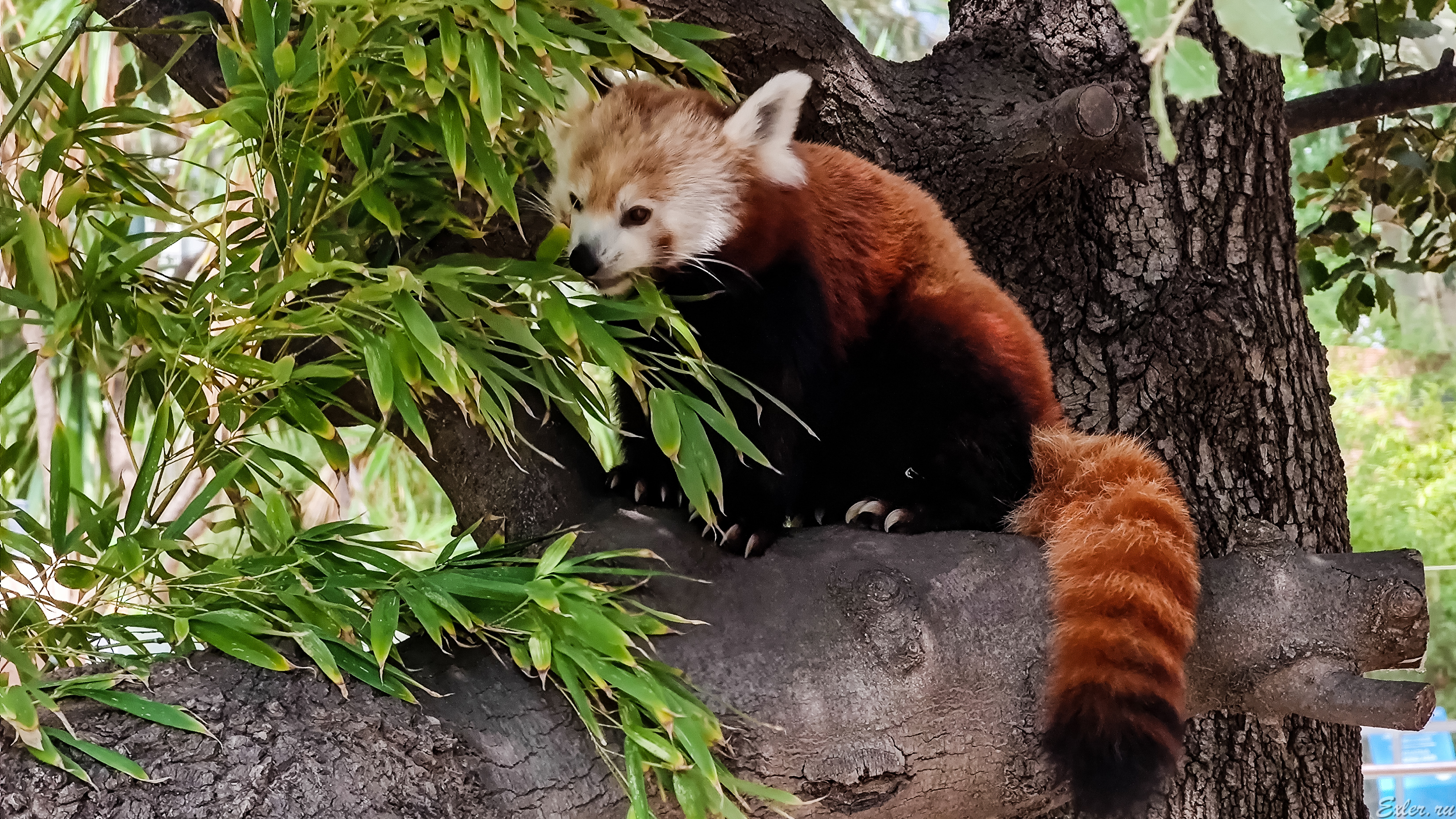 Кстати, увидеть красную панду в Барселонском зоопарке - большая удача, так как они - животные ночные, и днем панда обычно отсиживается в своем домике. Во время пяти визитов в Барселонский зоопарк мы красную панду так и не увидели, только пару раз хвост торчал из домика. Но вот как раз в 2021 году повезло - панда вышла из домика и отправилась полакомиться листьями, тут я ее и заснял!