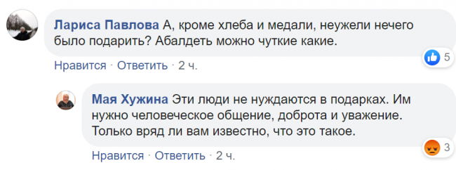 Upd: Хужина ответила на критику. Да они не нуждаются в подарках-то. Блокадницам и так отлично живется под крылышком Партии и Правительства.