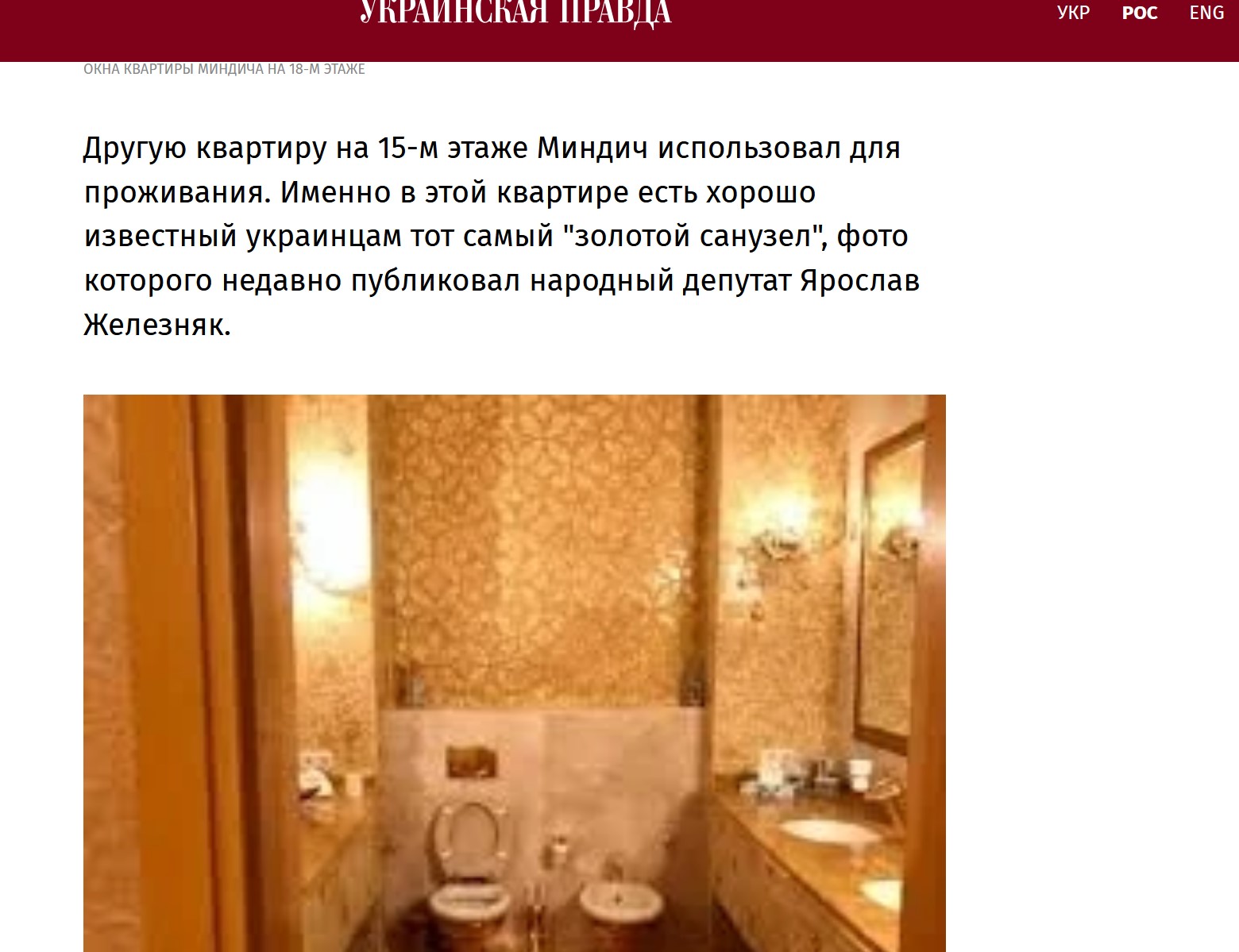 В приведенных вами ссылках из украинских СМИ ничего нет про "золотой унитаз Миндича". Хотя бы потому, что его не существует. А вот российские помойки вовсю разгоняют.