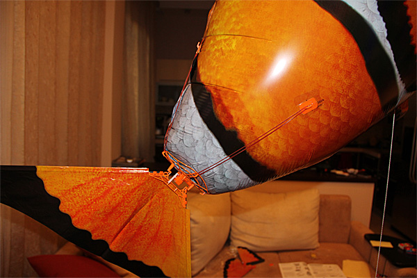 Вот так крепится хвост, с помощью которого она плавает по воздуху - простыми четырьмя резиночками.
