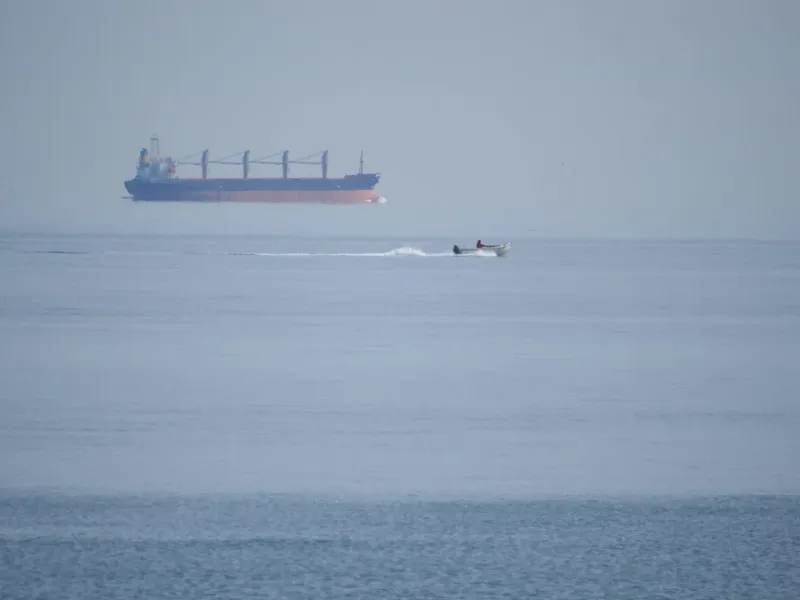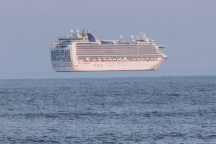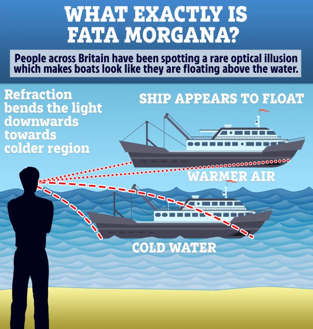 Это редкое природное явление под названием "Фата Моргана", которое происходит в тот момент, когда солнце нагревает атмосферу над морем. Воздух при этом делится на слои — тёплые и холодные, из-за чего световые лучи преломляются и возникает такой эффект.