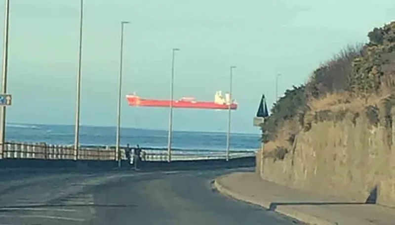 В Minster on Sea графства Кент, Великобритания, 5 мая наблюдали интереснейшее явление - парящие в воздухе контейнеровозы.