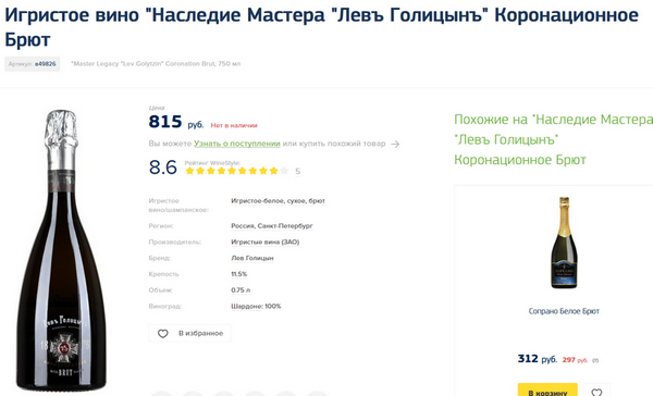 Оно, конечно, был бы повод для гордости, однако специалисты и разбирающиеся - в полном, так сказать, ахуе. Потому что этот "Лев Голицын" - галимая дешевка-шипучка, получаемая из хрен знает какого зарубежного балка методом быстрой шампанизации. У них там в линейке-то в основном полусладкие вина, благородной стоимости 250-350 рублей, так что вы понимаете, что это за помои.