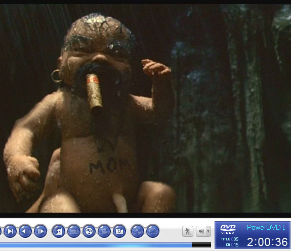 Как выяснилось, в хорошем фильме "Апокалипто" есть не только посторонние трупы. Оказывается, там и ребеночек у главного героя рождается более чем лихой. Правда, увидеть это можно только в одном кадре на 2-00-35 или 2-00-36 (в зависимости от плеера). Я еле-еле поймал, причем PowerDVD еще и скриншот не хотел делать - упорно скринил следующий кадр, далеко не такой веселый. Но я заскринил весь экран - и вот оно, боевое ацтекское дитя во всей красе!