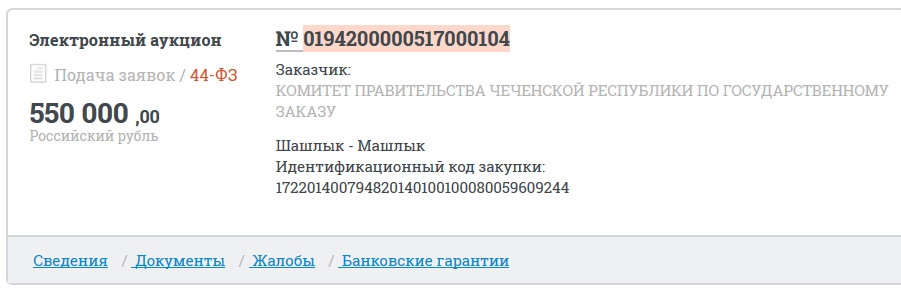 Прошел по цепочке чуть дальше. Вот тут www.etp-ets.ru при поиске процедуры "Шашлык-машлык" можно найти документацию на нее. Чиновники видимо хотят "скромное" застолье себе организовать. Дело житейское.