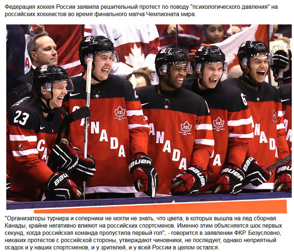 Причем кто-то, кто пропустил весь чемпионат. Вон, у белорусов наши как-то выиграли, хотя те покраснее канадцев (в смысле свитеров) будут.