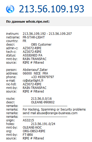 Но это все ладно. Есть атакующий IP, есть данные провайдера-хостера - прямо в Whois. Так вот, хохма в том, что за ДВЕ НЕДЕЛИ долбежа в этот чертов Orange Busuness Services - ни одна собака нам ДАЖЕ НЕ ОТВЕТИЛА, не говоря уж о том, что урод с этого IP к нам как долбился, так и долбится.