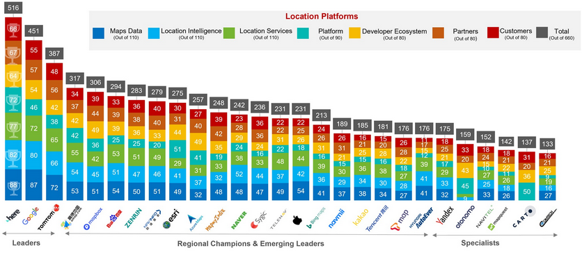 Специалисты Counterpoint Research проанализировали несколько десятков картографических приложений по семи категориям: картографические данные, анализ местоположения, службы определения местоположения, платформа, экосистема разработчика, партнёры и клиенты. Оказалось, что есть одно приложение, которое лидирует в каждом из этих направлений. Им стал сервис HERE, в прошлом принадлежавший Nokia, а ныне развиваемый консорциумом, куда входят Audi AG, BMW Group и Daimler AG. По словам аналитиков, успех HERE не в последнюю очередь обусловлен сотрудничеством с большим количеством партнёров по всему миру. Приложение получило 516 баллов из 660 возможных.