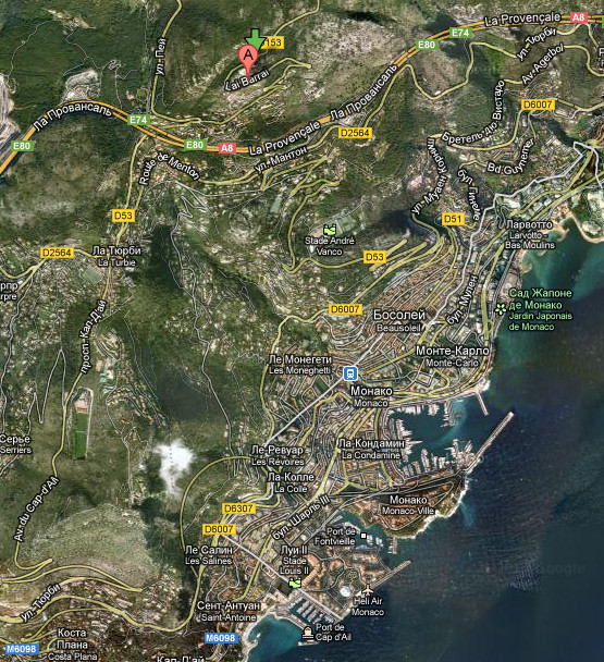 Никакой это не Антиб, мы туда доехали только на следующий день. Антиб приплетен только для рифмы. На самом деле мы забрались на одну из самых высоких точек над Монако, расположенную в точности вот здесь. Вот она на карте обозначена зеленой стрелкой.