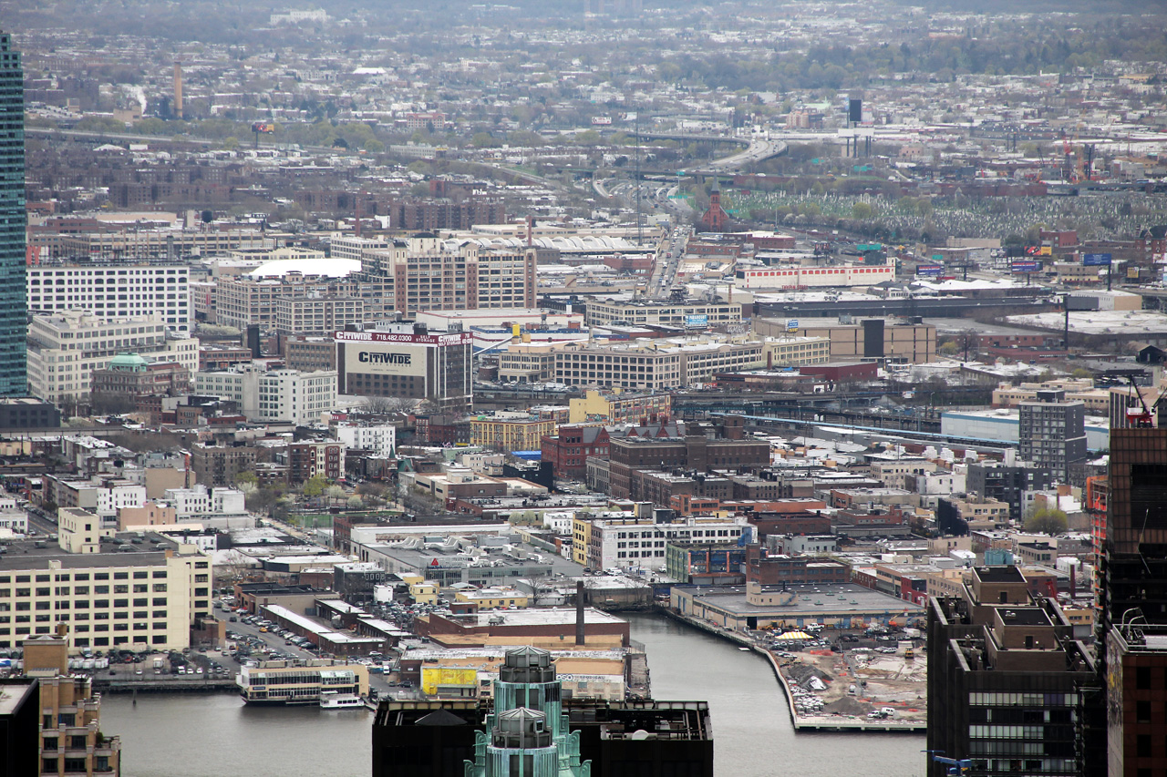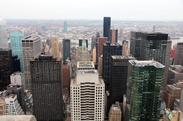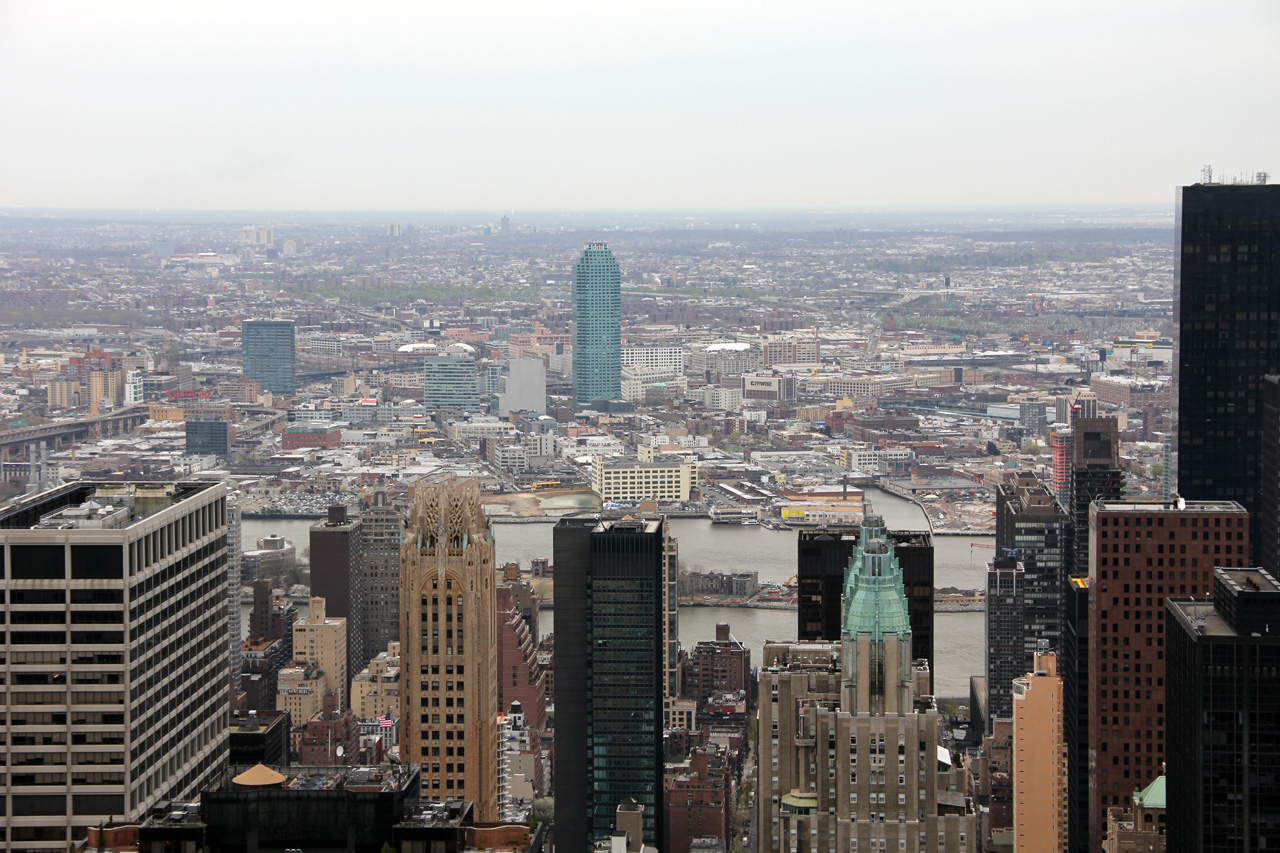Снимал с крыши "Рокфеллер-центра". У них это называется "Top of the rock". То есть сначала идет "30 rock", а потом "Top of the rock", то есть 65 rock. За билетиками можно долго стоять в живой очереди, а можно купить в киоске на улице на определенное время. Мне досталось на через полтора часа. Погулял по городу, пообедал, пришел к назначенному часу - прошел за две минуты. С погодой, правда, не повезло - сплошные тучи. Но все-таки что-то поснимал. Там система интересная. Ограждение на крыше - из толстенного стекла. Снимать было бы невозможно, однако между стеклянными панелями есть щели толщиной примерно в объектив. Так что можно хоть что-то зацепить. Ниже оно, зацепленное, и представлено. (Кликабельно, как обычно.)