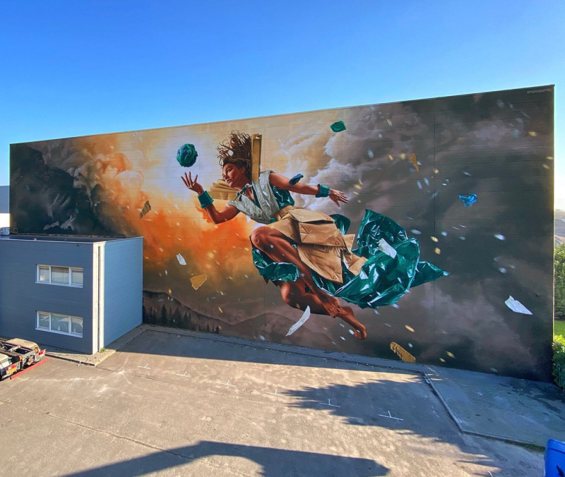 Компания CVB Ecologistics заказала Studio Giftig создание мурала, рассказывающего о том, за что выступает компания - к творческому подходу переработки отходов как сырья.