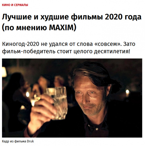 В издании "Maxim" опубликовали статью "Лучшие и худшие фильмы 2020 года". Составлял список Олег "Апельсин" Бочаров, так что статья отражает именно его пристрастия и антипатии. Что интересно, в подобных списках, кто бы их в действительности ни составлял, с легкостью можно менять местами лучшие с худшими и наоборот - и это все равно будет четко отражать вкусы определенной части аудитории. В данном случае нужно знать, что в лучшие у Олега попал более чем спорный "Маяк" и вполне отстойный фильм "Спутник", а что изумительный "Манк" Олегом снисходительно упомянут в описании "Маяка" и по поводу него Олег заметил, что Финчер, дескать, не удосужился снабдить картину признаками хорошего кино. Ну, бывает, имеет право - это его мнение. (Кстати, какой именно фильм-победитель стоит целого десятилетия - я так и не понял.)