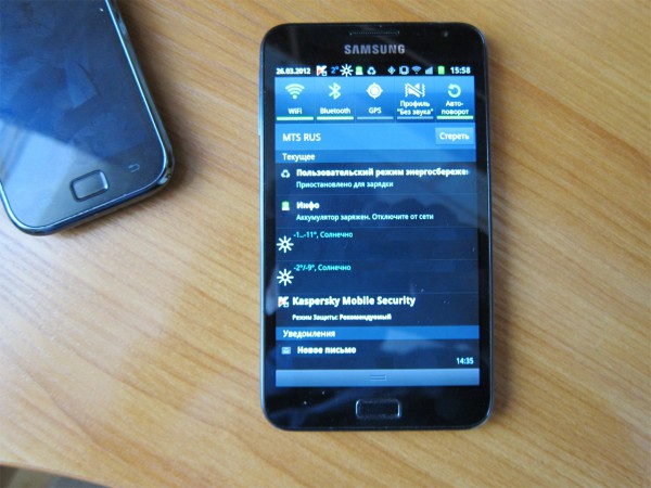 Ничего себе номер Samsung Galaxy Note вчера выдал. Я с ним с утра ездил по делам. Навигация, шмавигация, Интернет, фиганет и все такое. Короче говоря, батарея разрядилась процентов на 50. Приехал домой, положил телефон на стол. Через пару часов телефон вдруг издает сигнал полной зарядки и пишет, что его, мол, можно отключить от сети. Заряд - 100%. Телефон при этом считает, что подключен к сети. Хотя ни к чему он не подключен, у него включены Wi-Fi и Bluetooth. Рядом с ним лежит подключенный к сети Samsung Galaxy S. Но это явно не имеет отношения к делу.