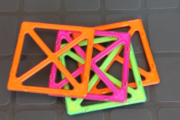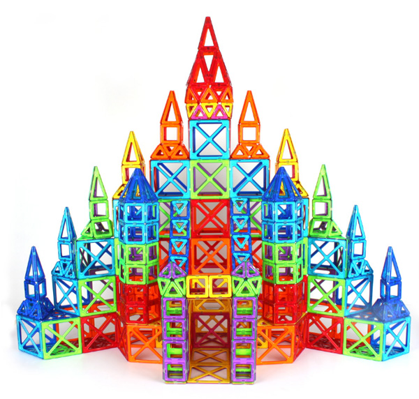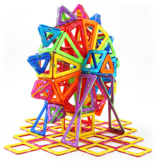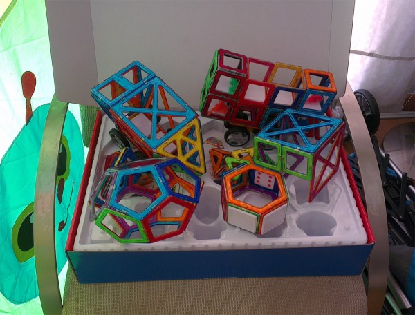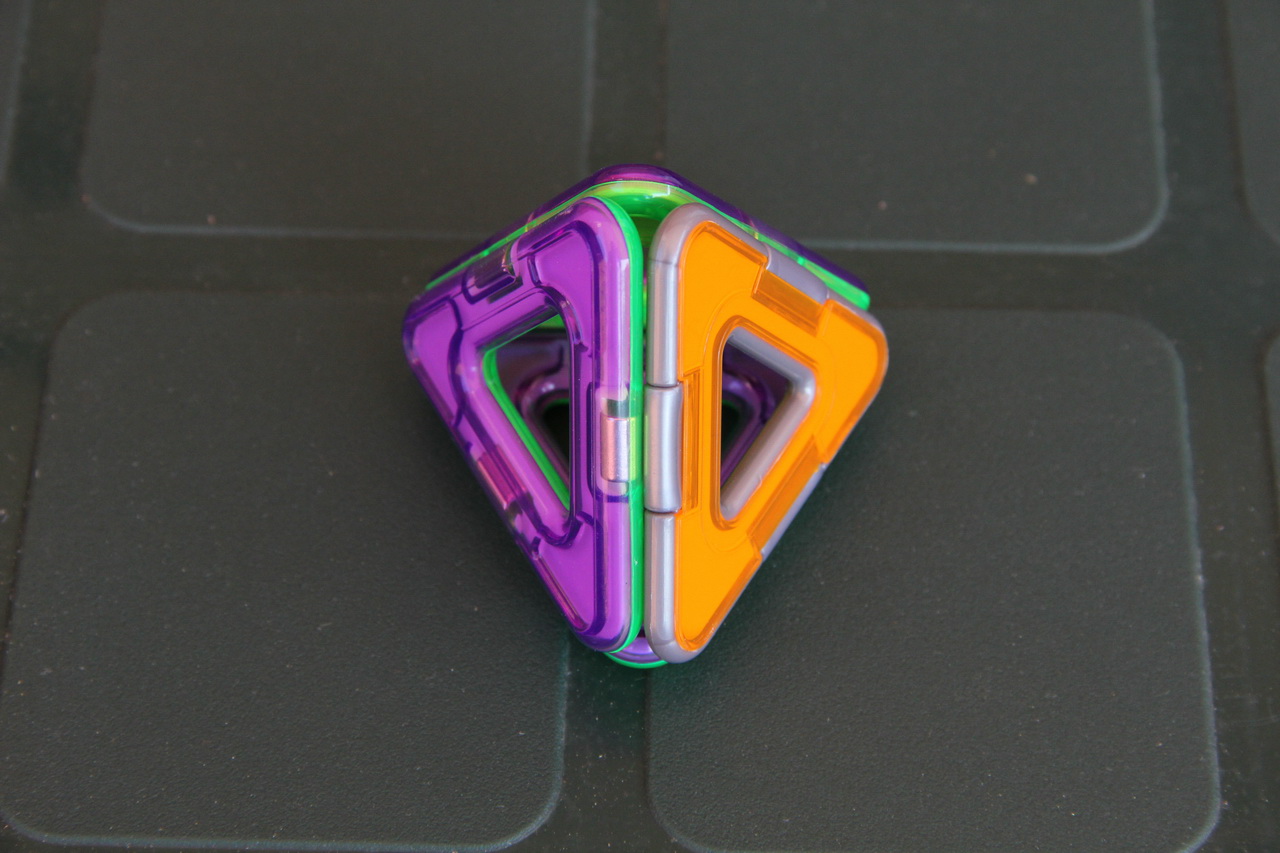 Так вот, штука оказалась реально очень интересная и увлекательная. Это набор из различных геометрических фигурок, снабженных несколькими магнитиками. Они легко сцепляются между собой как плашмя, так и торцами, образуя причудливые конструкции.