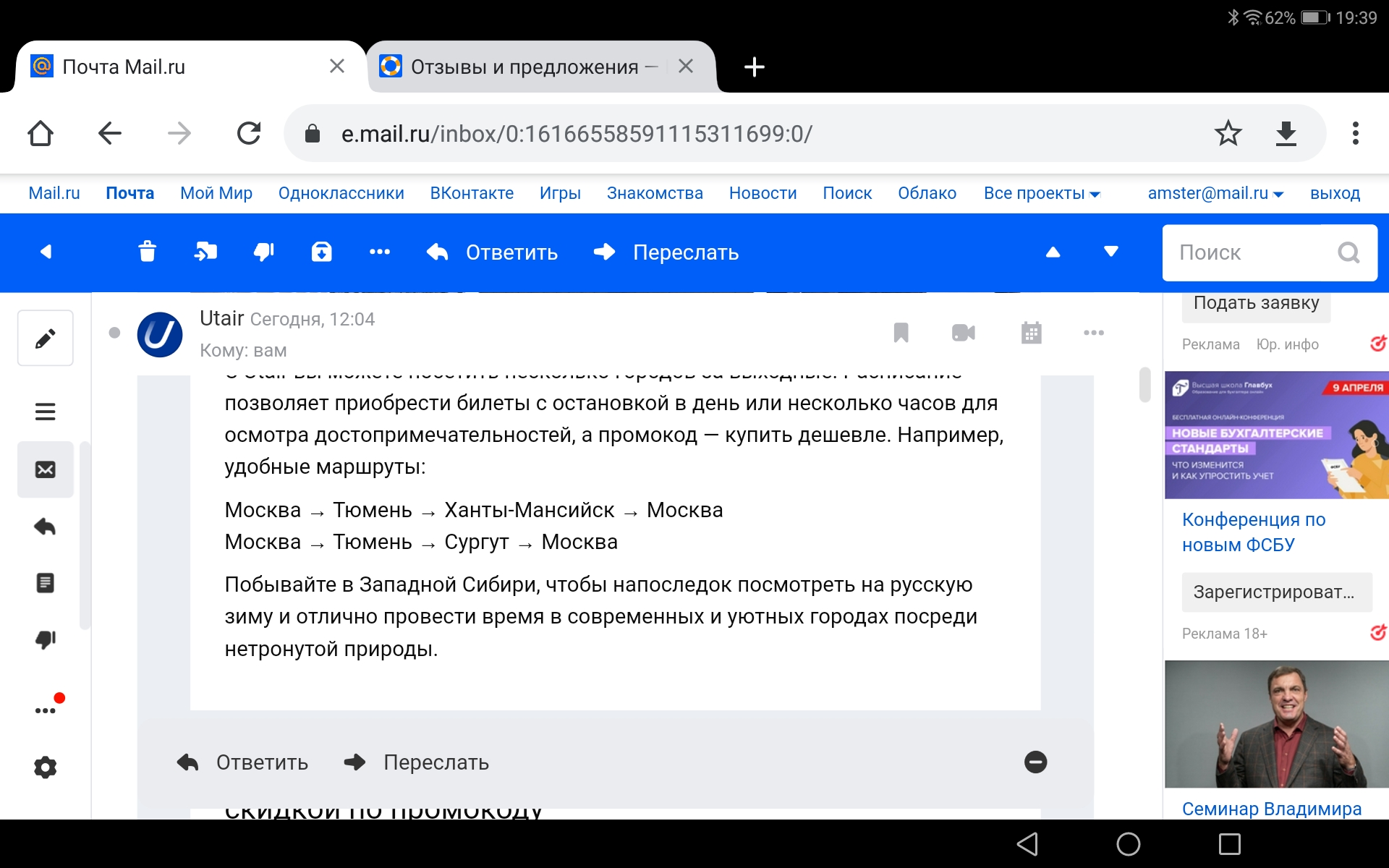 зачем вам на планшете заходить в почту через браузер, когда есть приложение.