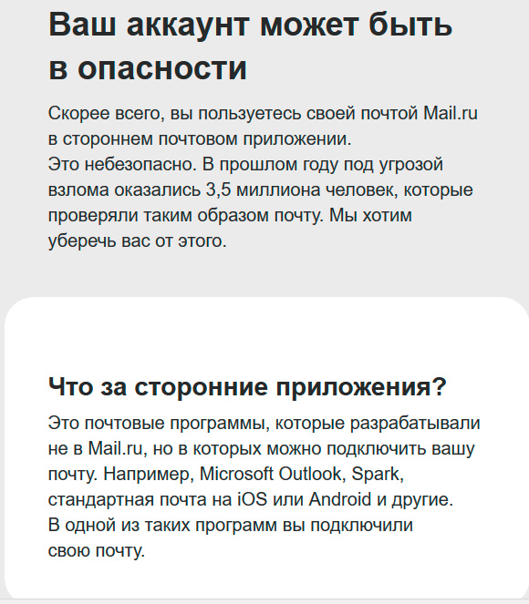 Mail.ru заметил СТРАШНОЕ и прислал предупреждение! Пользуешься, понимаешь, нашей почтой во всяком отстое, вроде стандартной почты Apple, Google и Microsoft Outlook, а потом будешь жаловаться, что галоши пропадают! Поломают Microsoft Outlook - к нам жаловаться не приходи, говорит Mail.ru.
