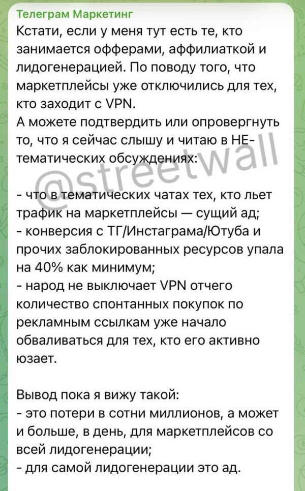 Они это сделали, ну и результаты не заставили себя ждать: конверсия трафика со всяких заблокированных в РФ сервисах - YouTube, Instagram, Twitter, Telegram  и так далее упала практически в два раза, так называемые импульсные покупки практически пропали, пользователей из Казахстана, Беларуси и так далее - не пускают, так как маркетплейс считает, что у них включен VPN, ну и в результате идет очень сильное снижение количества заказов, падает эффективность рекламы, ну и потери маркетплейсов уже оцениваются в сотни миллионов рублей. Соответственно, они заплатят в бюджет меньше налогов.